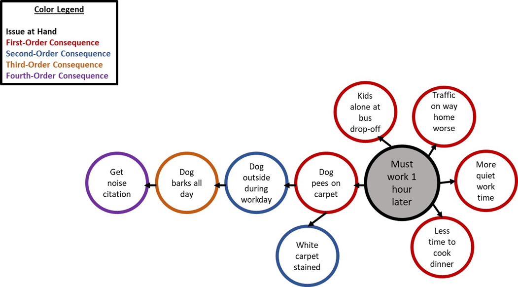 Below, the precipitating issue is that my work schedule has changed, and I must stay one hour later every day. There are five first-order, direct consequences of this on the Futures Wheel. I have chosen to map out the indirect consequences of only one of them to keep things simple. Ideally, all the direct consequences would get the same treatment. Tracing this through you can see how working an hour later each day might lead to a police citation and a stained carpet.