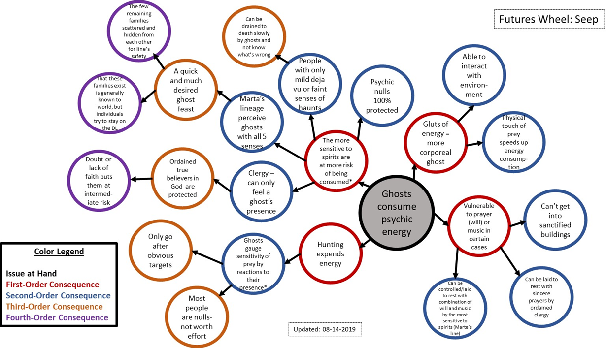 I used the Futures Wheel to explore the implications of how my ghosts eat in a story I am writing. In this case, the short story was already in a more-or-less complete rough draft, and I was testing out my logic. I wrote what I thought was the foundation of my world in the middle and started applying my rules in waves of consequences to see if everything fit together.