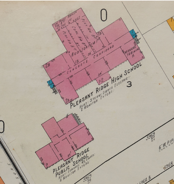 It turns out that the village of Pleasant Ridge had yet to be annexed into the city of Cincinnati, so was not included in 1904 Cincinnati Sandborn maps. Luckily I found what I needed in the 1917 edition, where I located documentation of the 1872/1892 school and the 1909 high school co-located on the property.