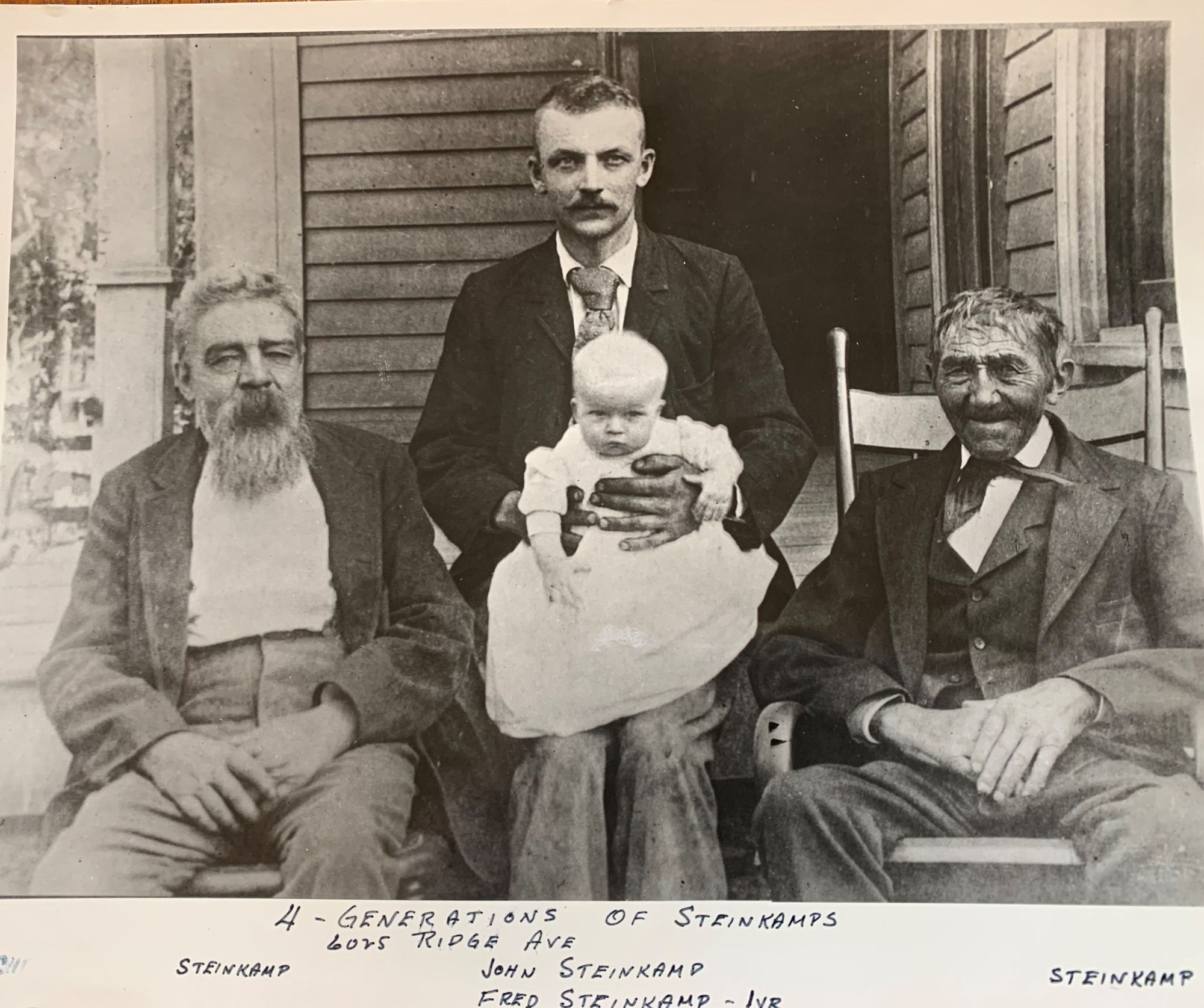 As I fell deeper into my research of the 1904 Pleasant Ridge disaster, I became particularity drawn to two people. These were Emily “Emma” Steinkamp and her Father Johann, who went by John, who is in the middle of the photo below. His father, Christian Ludwig Wilhelm, is on the left. His grandfather, also named Christian, is on the right. Baby Fred was Emily’s little brother, who would have been about ten years old when she drowned, based on information from the 1900 Census.
